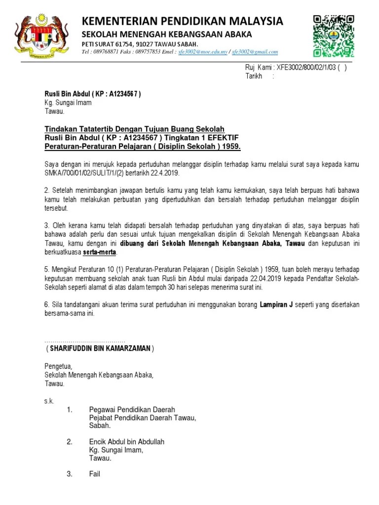 4 tahun 1991 bertarikh 1951991 menegaskah supaya pengetua guru besar . Contoh surat pertuduhan untuk tujuan gantung sekolah sebagai hukuman tatatertib later head sekolah ruj. Bil9/1975( murid boleh digantung sekolah atau dibuang sekolah). Surat rayuan dibuang asrama kecemasan 2. Contoh surat amaran ponteng sekolah rendah. Contoh surat pertuduhan untuk tujuan gantung sekolah sebagai hukuman. Lampiran d lampiran d contoh surat gantung sekolah untuk tujuan penyiasatan sehingga tindakan tatatertib selesai. Sekolah menengah kebangsaan alam semesta . Lampiran b contoh surat pertuduhan gantung sekolah sebagai hukuman tatatertib download kumpulan . 86554280 contoh format surat permohonan kutipan bayaran tambahan 2012.